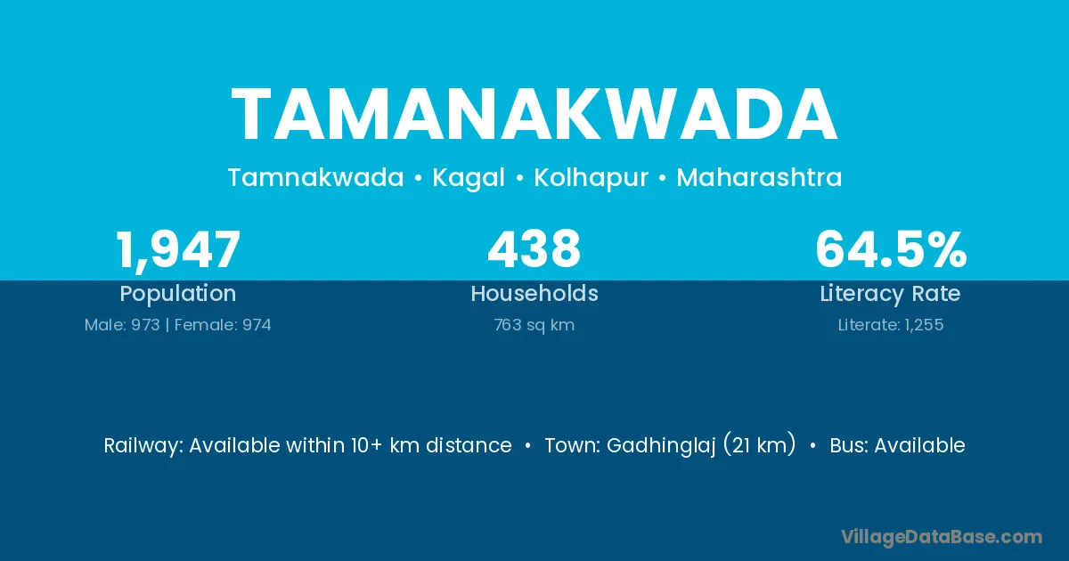 Gadhinglaj (21 km) is the nearest town to Tamanakwada village for major economic activities and is located approximately 21 km away.
