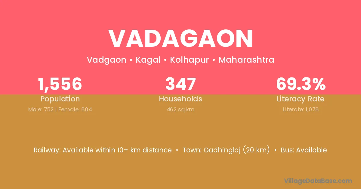 Vadagaon village has a total population of 1,556 people, of which 752 are males and 804 are females.