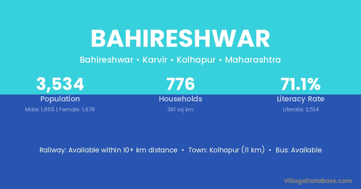 Kolhapur (11 km) is the nearest town to Bahireshwar village for major economic activities and is located approximately 11 km away.