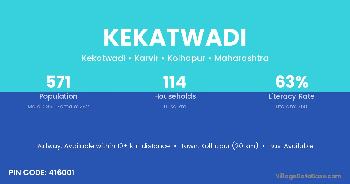 Kekatwadi village has a total population of 571 people, of which 289 are males and 282 are females.