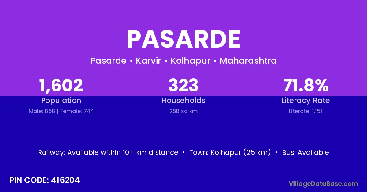 Kolhapur (25 km) is the nearest town to Pasarde village for major economic activities and is located approximately 25 km away.