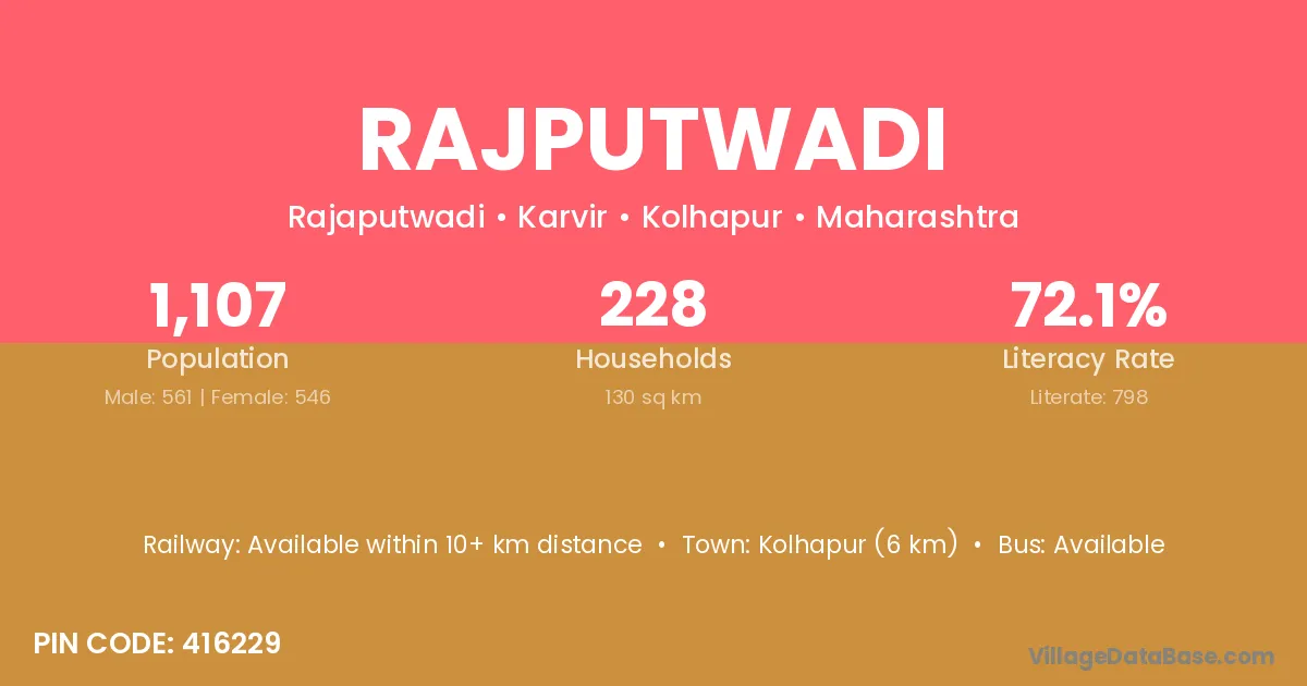 Kolhapur (6 km) is the nearest town to Rajputwadi village for major economic activities and is located approximately 6 km away.