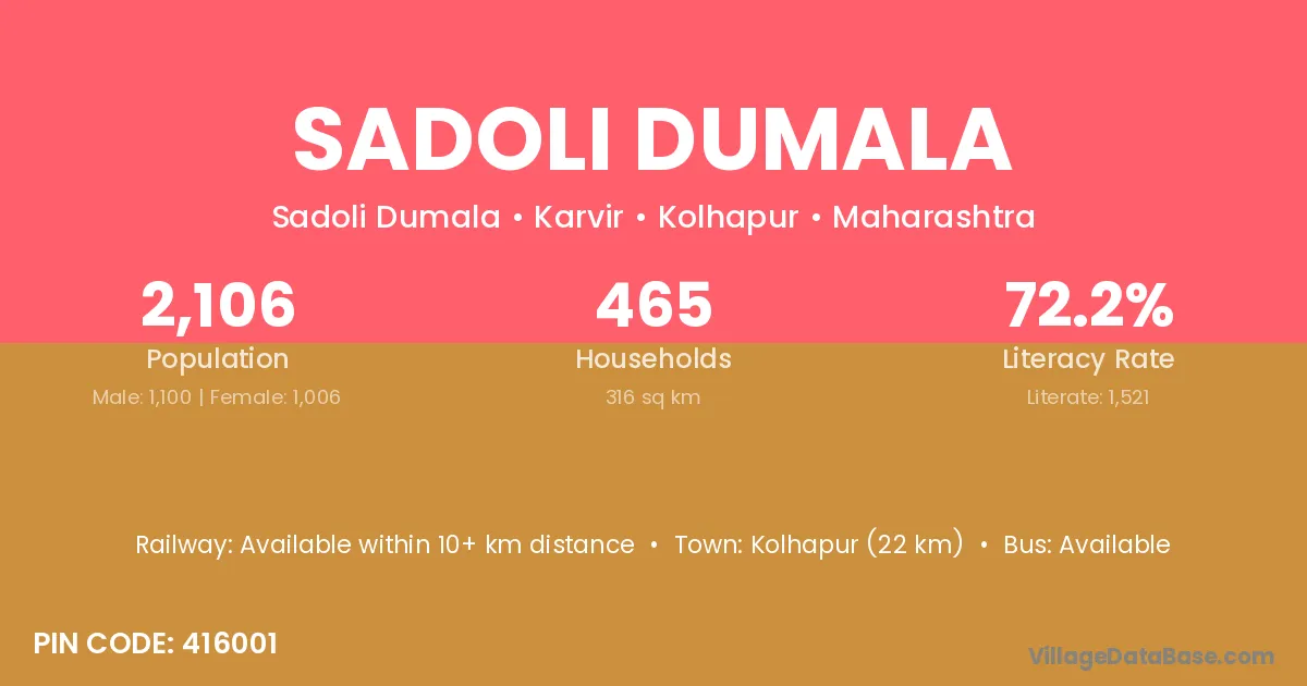 Kolhapur (22 km) is the nearest town to Sadoli Dumala village for major economic activities and is located approximately 22 km away.