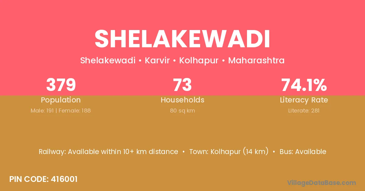 Shelakewadi village has a total population of 379 people, of which 191 are males and 188 are females.