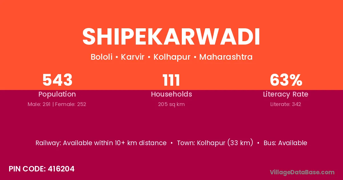 Kolhapur (33 km) is the nearest town to Shipekarwadi village for major economic activities and is located approximately 33 km away.