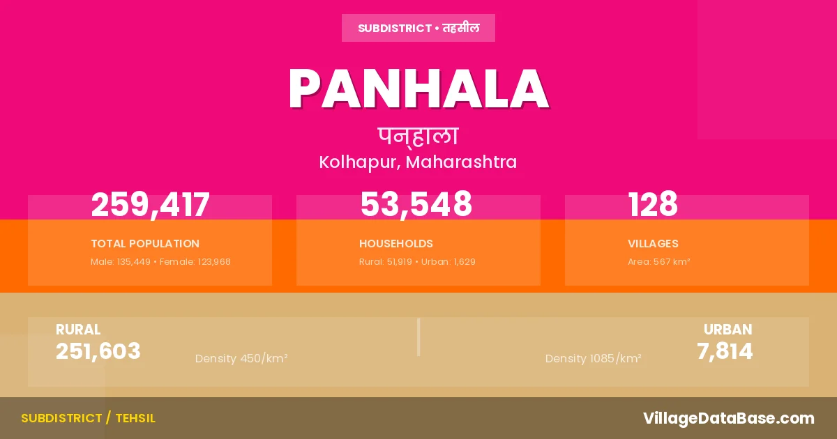 According to the 2011 census The total area of Panhala Tehsil is 567 km², with a population of 259417 people. The population density is 458 inhabitants per square kilometre, and there are approximately 53548 houses in the sub district.