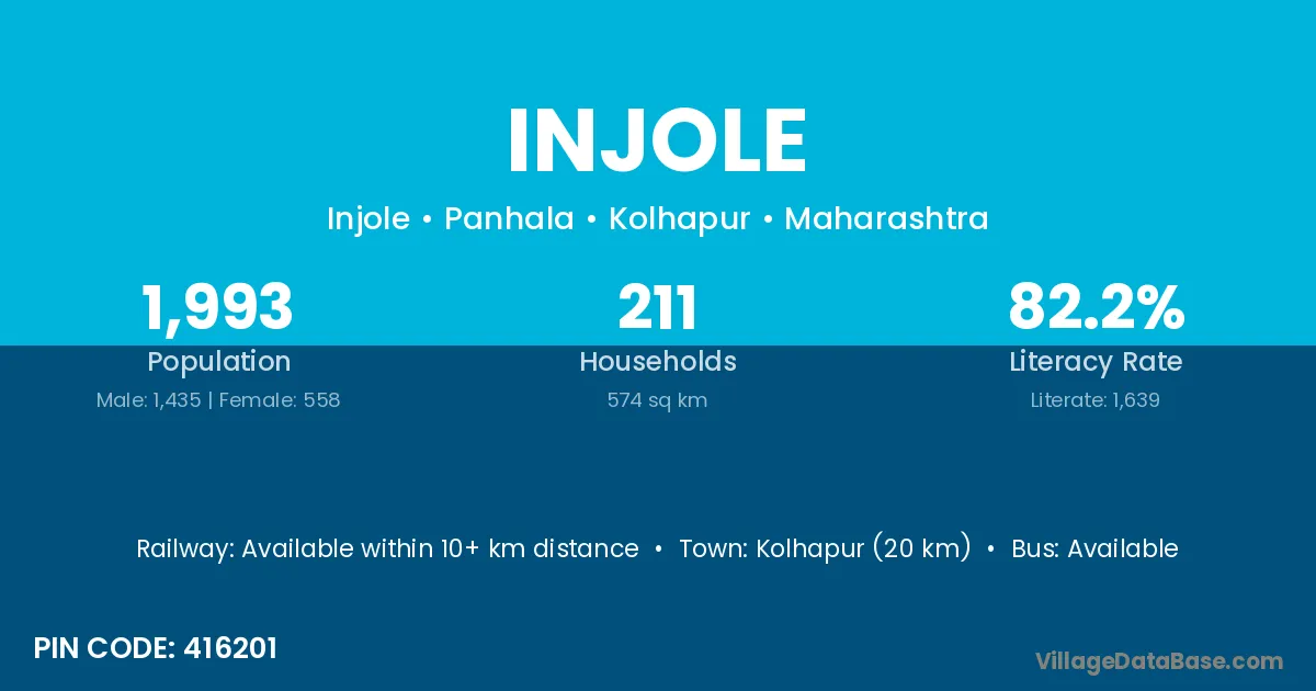 Kolhapur (20 km) is the nearest town to Injole village for major economic activities and is located approximately 20 km away.