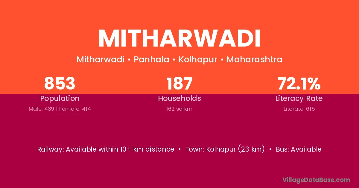 Kolhapur (23 km) is the nearest town to Mitharwadi village for major economic activities and is located approximately 23 km away.