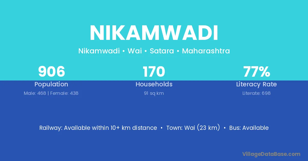 The literacy rate of Nikamwadi village is 70.68%. Male literacy stands at 81.36% and female literacy at 58.36%.