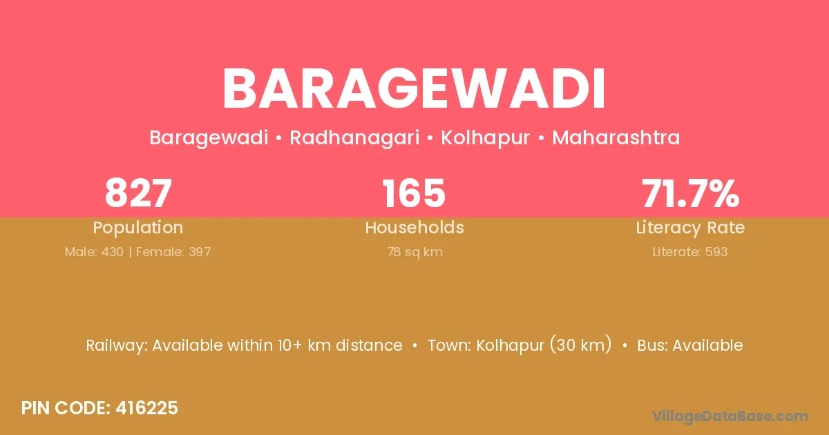 Kolhapur (30 km) is the nearest town to Baragewadi village for major economic activities and is located approximately 30 km away.