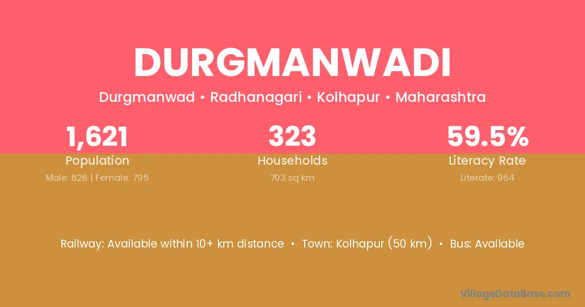 Kolhapur (50 km) is the nearest town to Durgmanwadi village for major economic activities and is located approximately 50 km away.