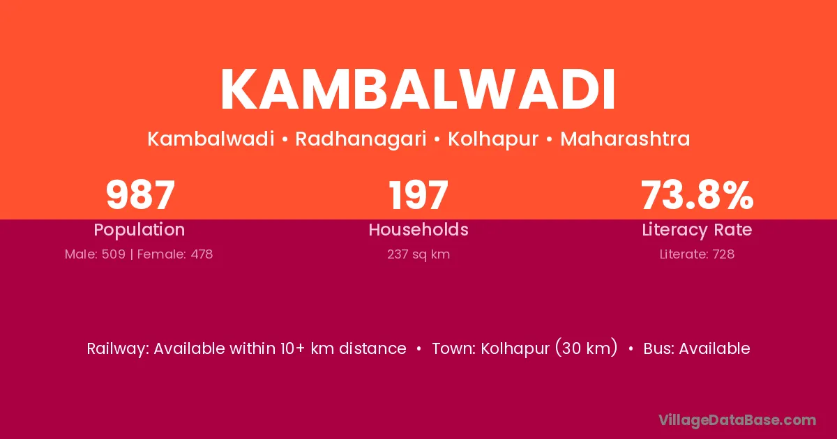 Kambalwadi village has a total population of 987 people, of which 509 are males and 478 are females.
