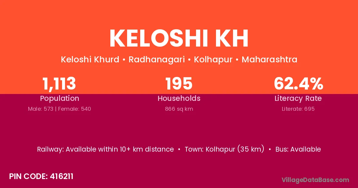 Kolhapur (35 km) is the nearest town to Keloshi Kh village for major economic activities and is located approximately 35 km away.