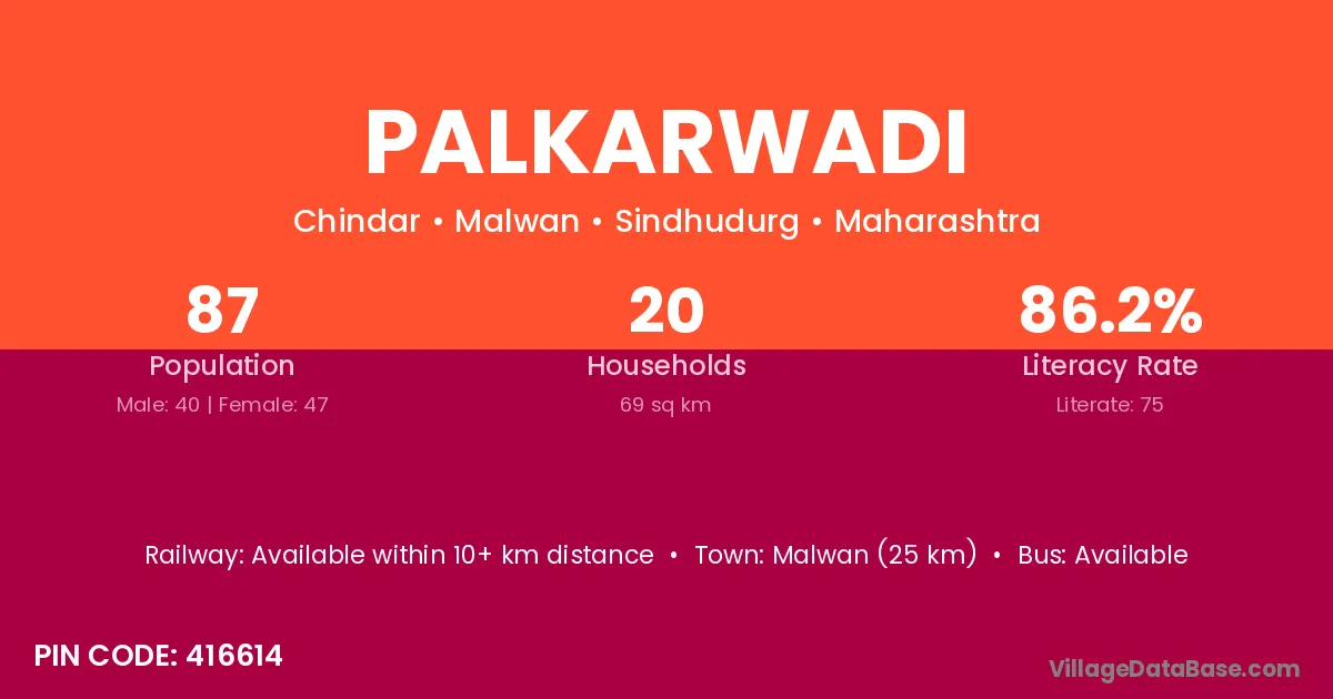 The literacy rate of Palkarwadi village is 71.88%. Male literacy stands at 80.26% and female literacy at 62.77%.