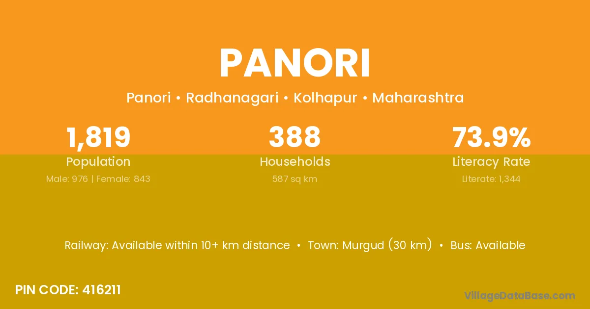Murgud (30 km) is the nearest town to Panori village for major economic activities and is located approximately 30 km away.