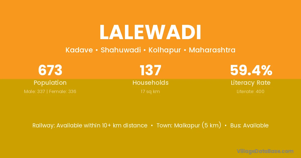 Lalewadi village has a total population of 673 people, of which 337 are males and 336 are females.