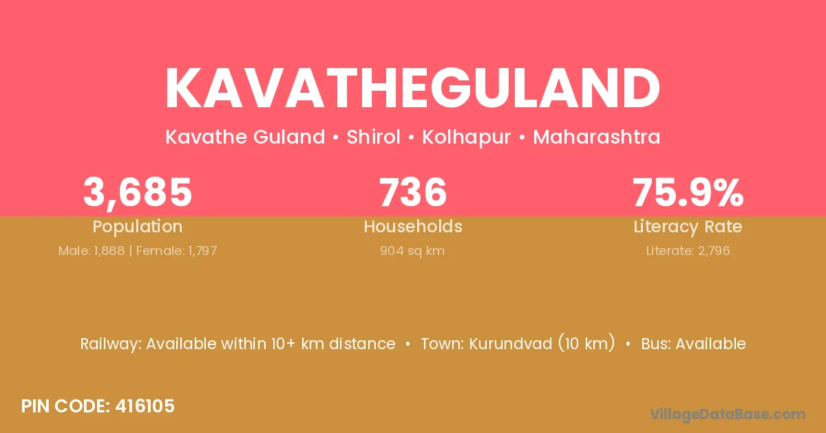 Kurundvad (10 km) is the nearest town to Kavatheguland village for major economic activities and is located approximately 10 km away.