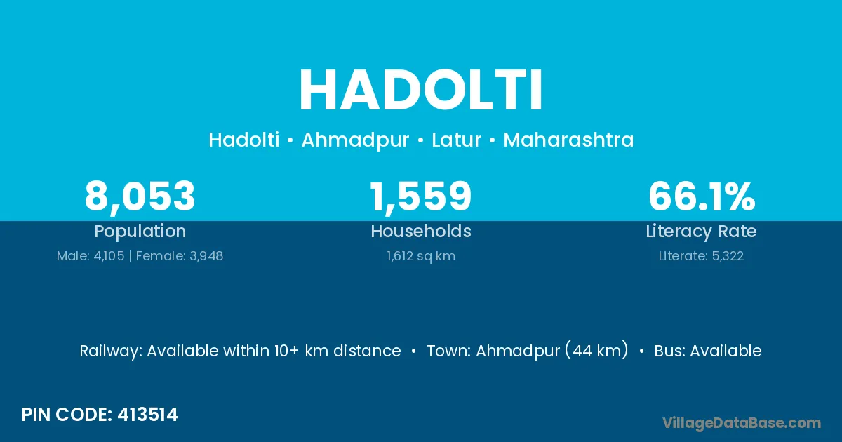 Ahmadpur (44 km) is the nearest town to Hadolti village for major economic activities and is located approximately 44 km away.