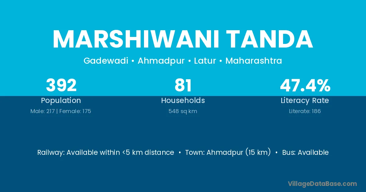 Ahmadpur (15 km) is the nearest town to Marshiwani Tanda village for major economic activities and is located approximately 15 km away.