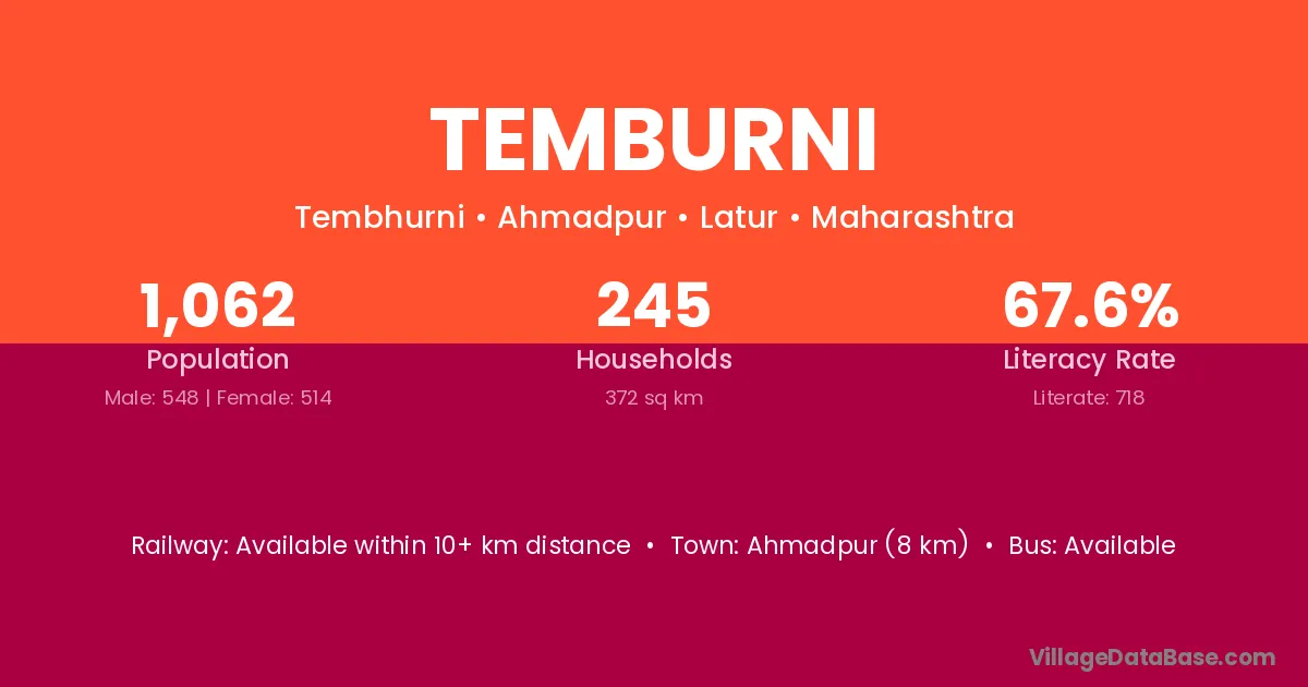 Ahmadpur (8 km) is the nearest town to Temburni village for major economic activities and is located approximately 8 km away.