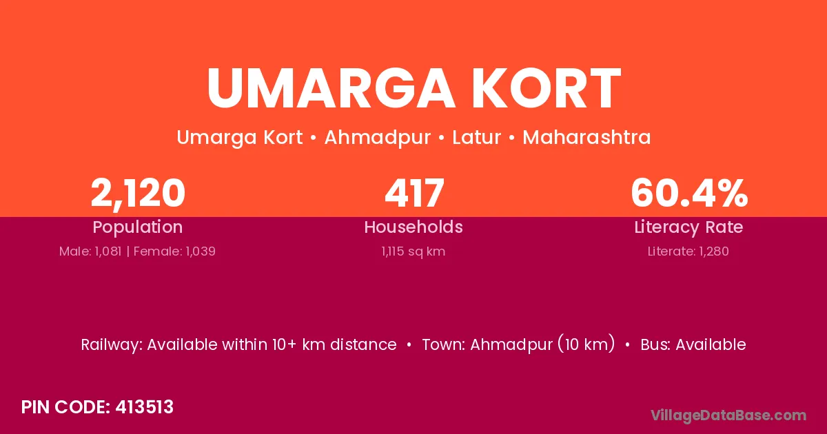 Ahmadpur (10 km) is the nearest town to Umarga Kort village for major economic activities and is located approximately 10 km away.