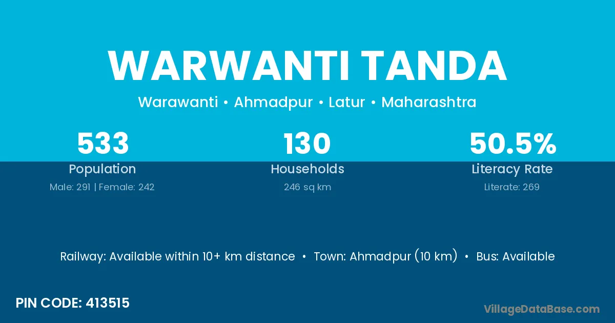 Ahmadpur (10 km) is the nearest town to Warwanti Tanda village for major economic activities and is located approximately 10 km away.