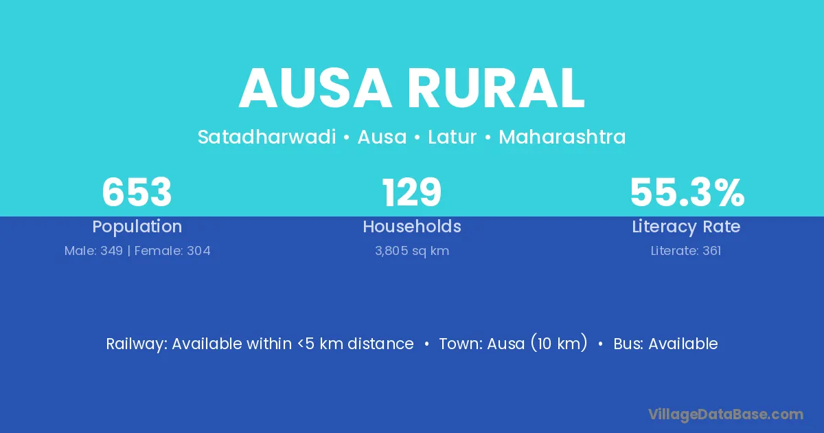 The literacy rate of Ausa Rural village is 55.28%. Male literacy stands at 64.18% and female literacy at 45.07%.