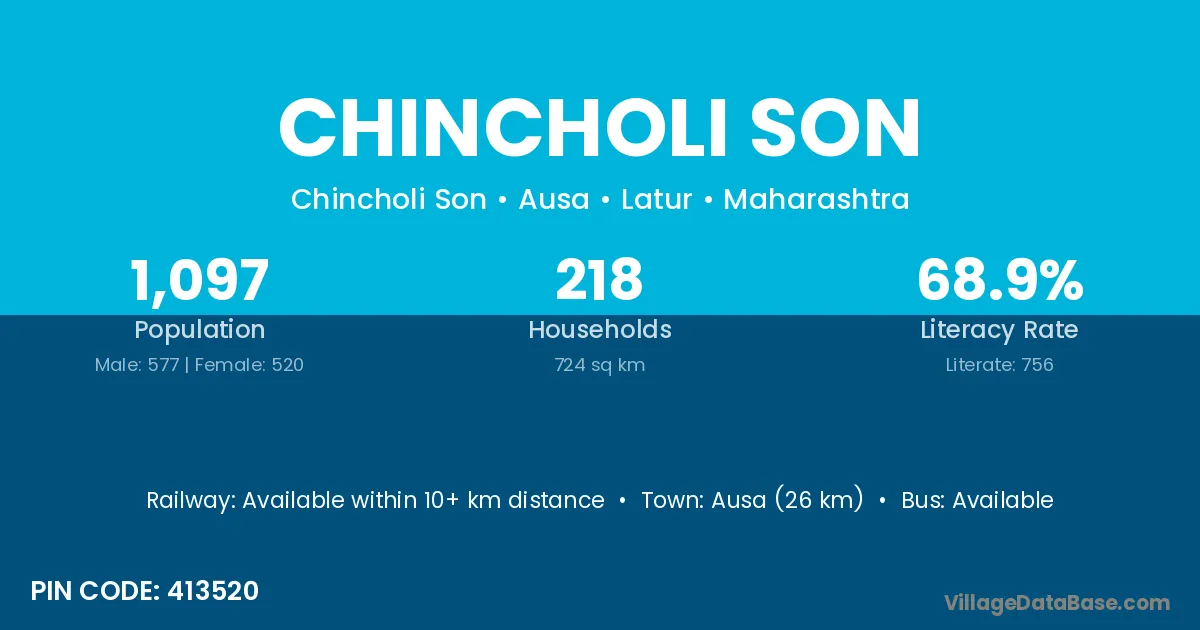 Ausa (26 km) is the nearest town to Chincholi Son village for major economic activities and is located approximately 26 km away.