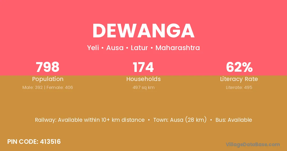 Ausa (28 km) is the nearest town to Dewanga village for major economic activities and is located approximately 28 km away.