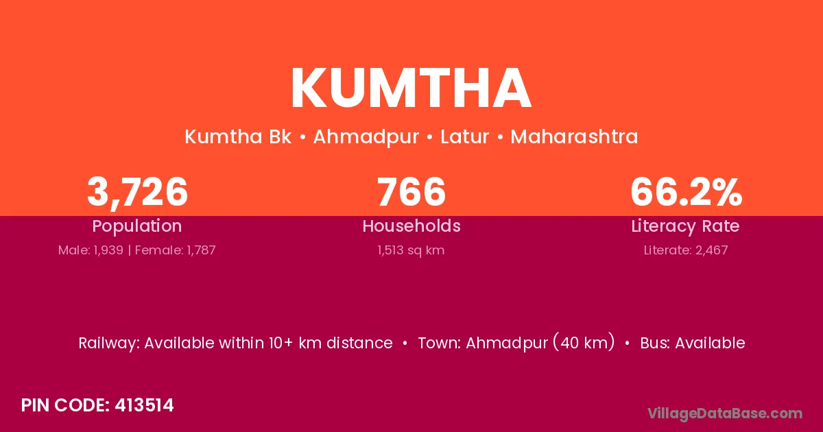 Ausa (30 km) is the nearest town to Kumtha village for major economic activities and is located approximately 30 km away.