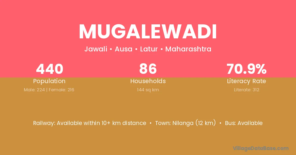 Mugalewadi village has a total population of 440 people, of which 224 are males and 216 are females.