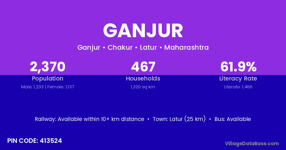 Latur (25 km) is the nearest town to Ganjur village for major economic activities and is located approximately 25 km away.