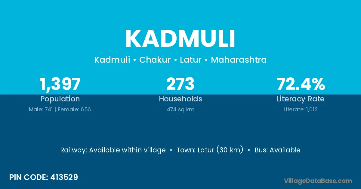 Latur (30 km) is the nearest town to Kadmuli village for major economic activities and is located approximately 30 km away.