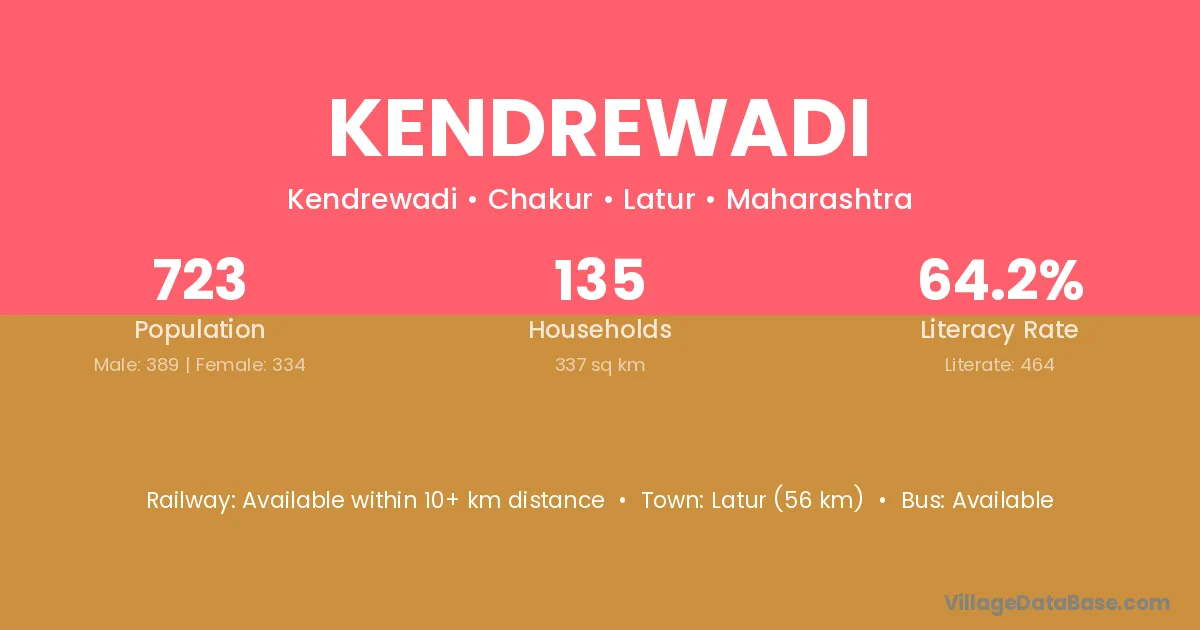 Kendrewadi village has a total population of 723 people, of which 389 are males and 334 are females.