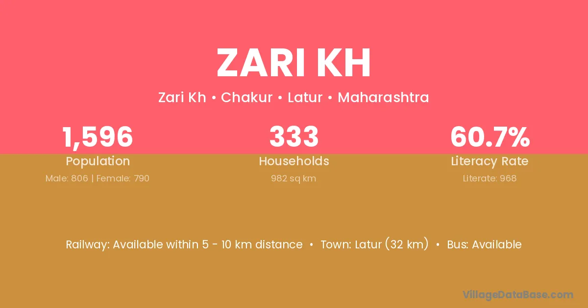 Latur (32 km) is the nearest town to Zari Kh village for major economic activities and is located approximately 32 km away.