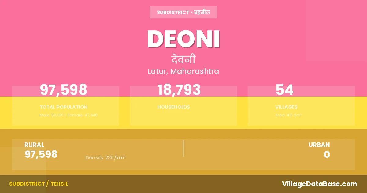 According to the 2011 census The total area of Deoni Tehsil is 415 km², with a population of 97598 people. The population density is 235 inhabitants per square kilometre, and there are approximately 18793 houses in the sub district.
