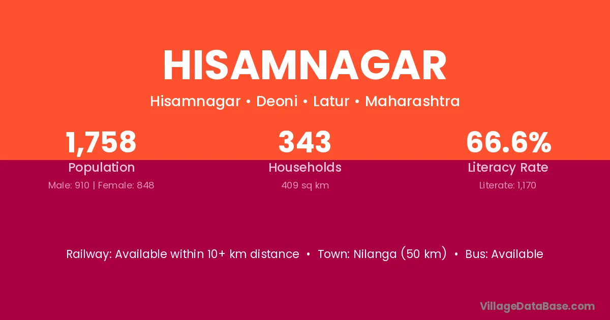 Nilanga (50 km) is the nearest town to Hisamnagar village for major economic activities and is located approximately 50 km away.