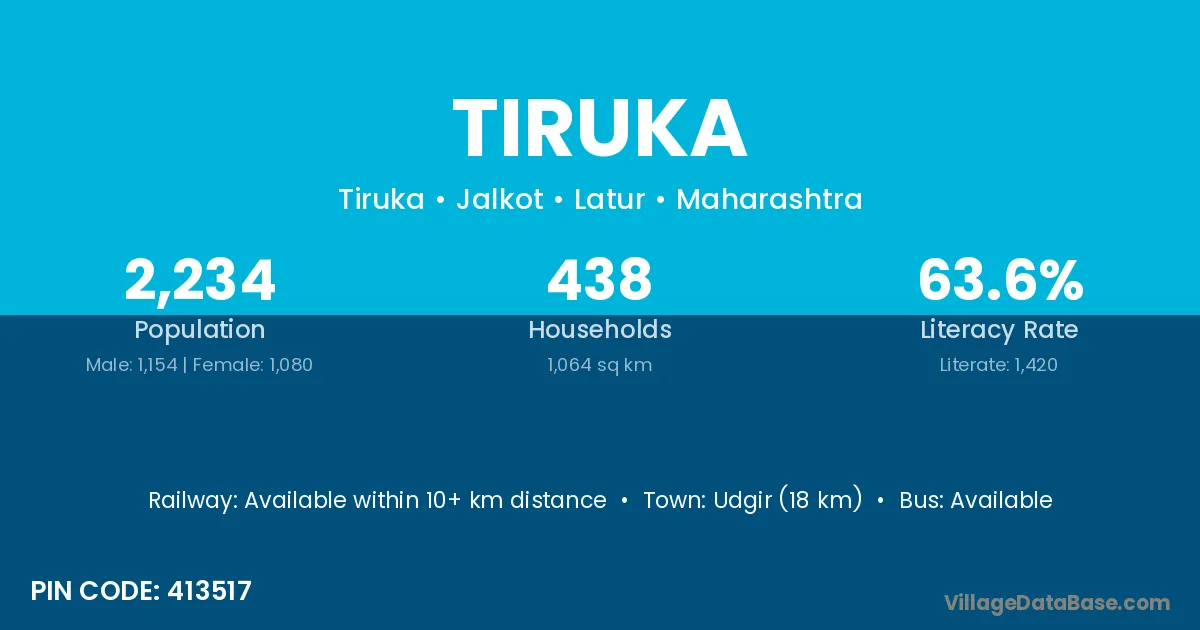 Udgir (18 km) is the nearest town to Tiruka village for major economic activities and is located approximately 18 km away.
