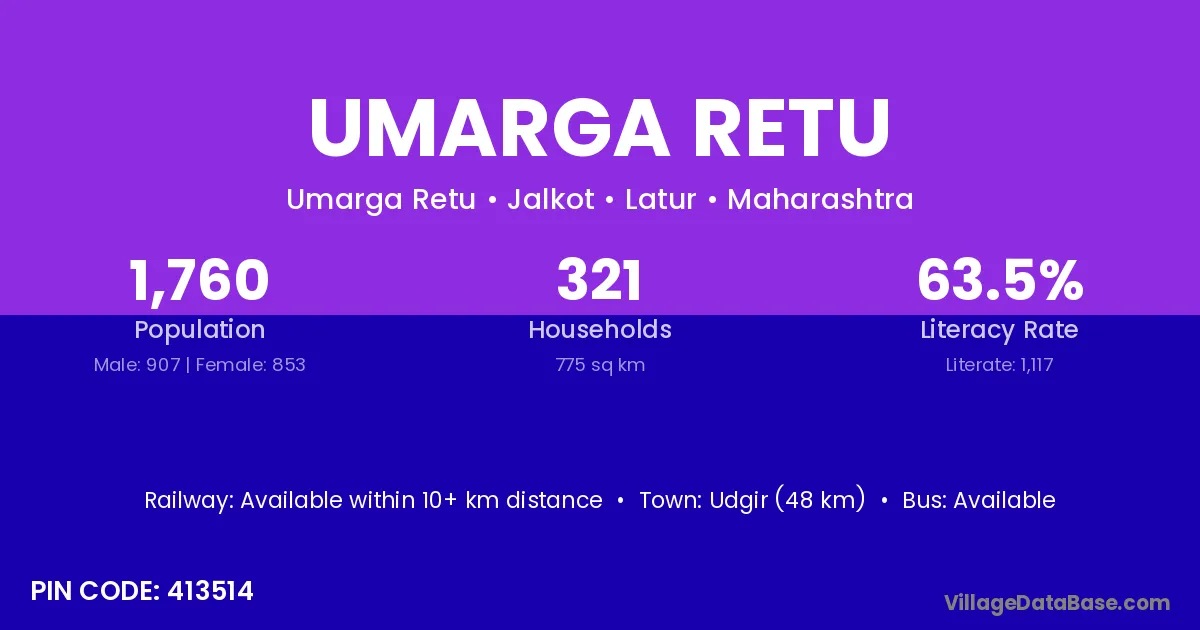 Udgir (48 km) is the nearest town to Umarga Retu village for major economic activities and is located approximately 48 km away.