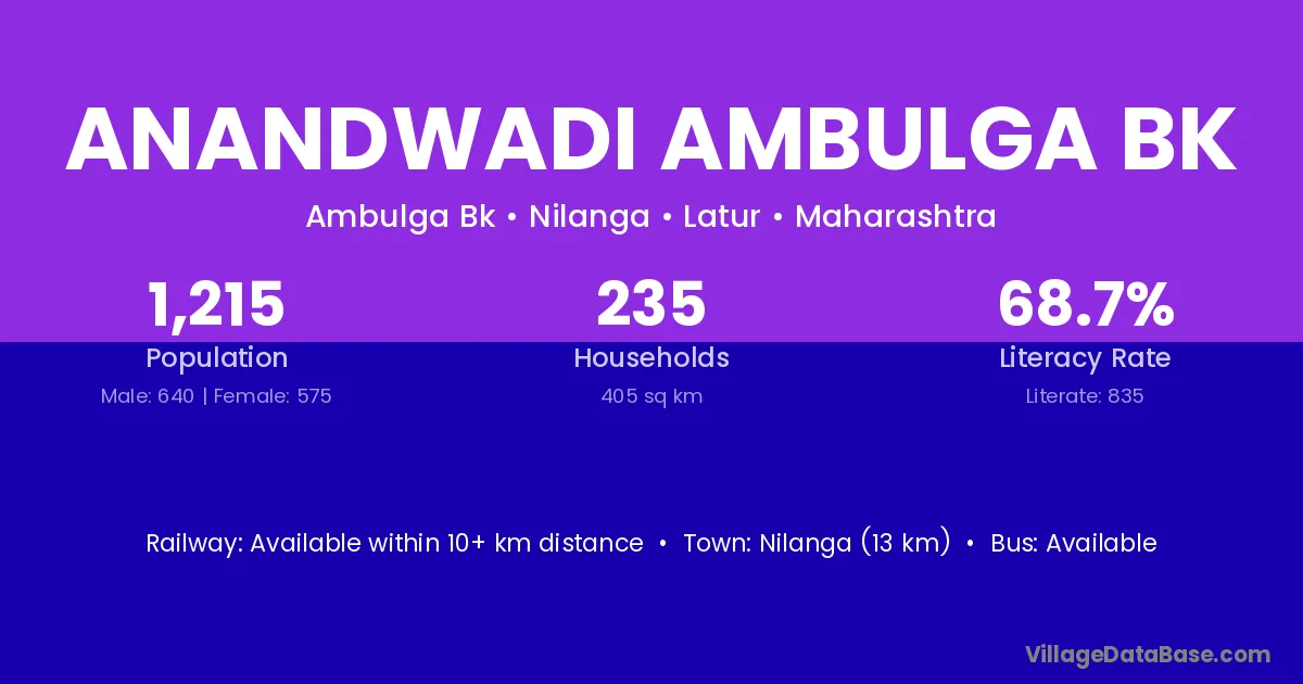 Nilanga (13 km) is the nearest town to Anandwadi Ambulga Bk village for major economic activities and is located approximately 13 km away.