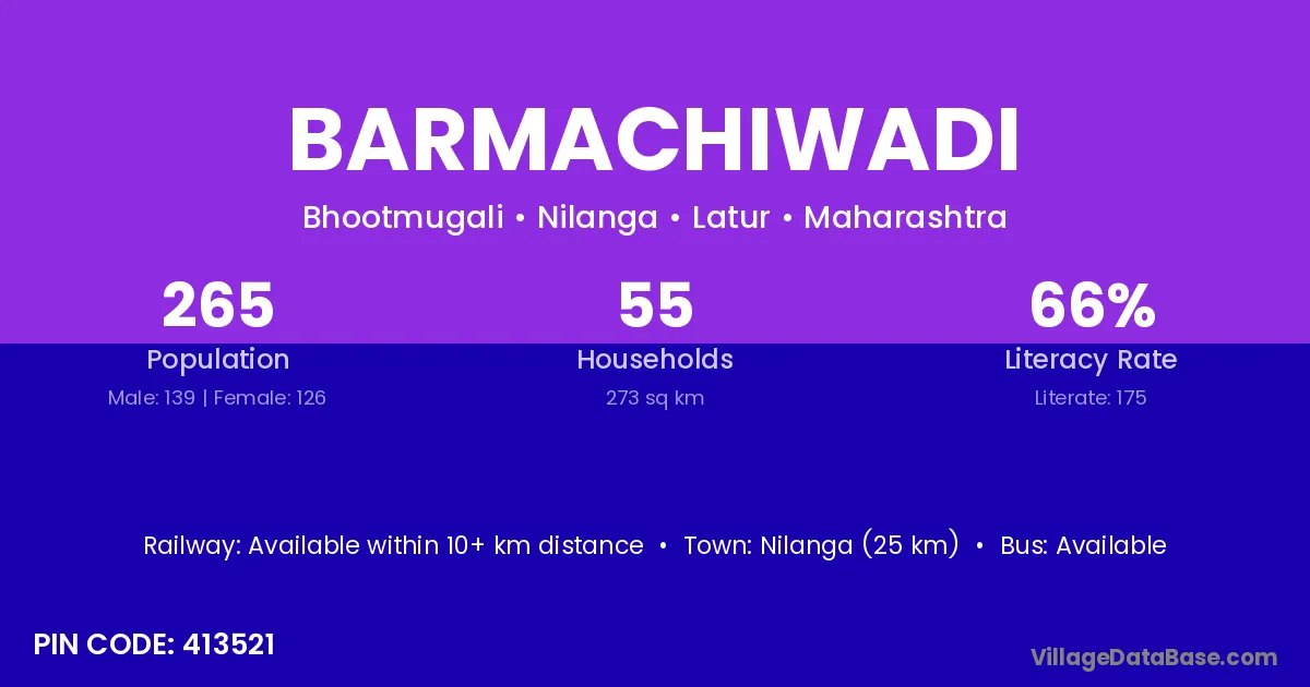Nilanga (25 km) is the nearest town to Barmachiwadi village for major economic activities and is located approximately 25 km away.