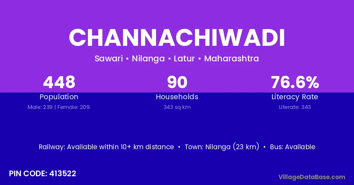 Nilanga (23 km) is the nearest town to Channachiwadi village for major economic activities and is located approximately 23 km away.