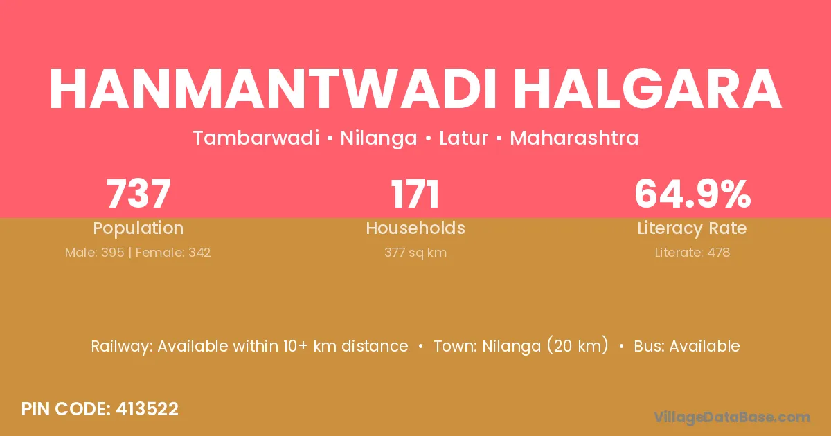 Nilanga (20 km) is the nearest town to Hanmantwadi Halgara village for major economic activities and is located approximately 20 km away.