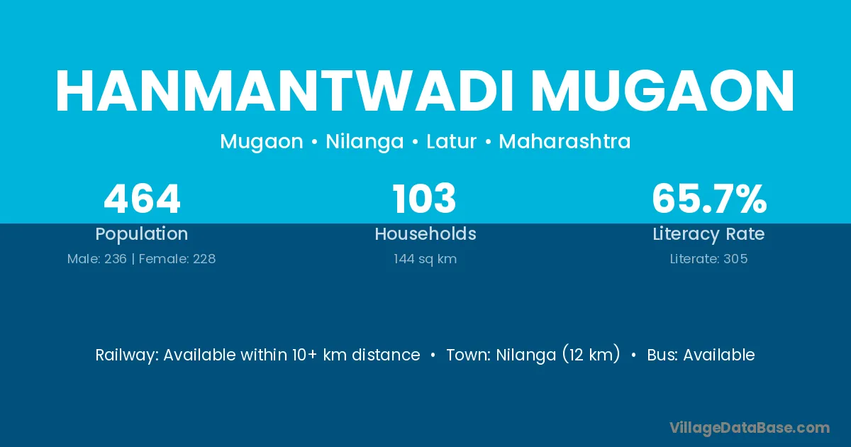 Nilanga (12 km) is the nearest town to Hanmantwadi Mugaon village for major economic activities and is located approximately 12 km away.