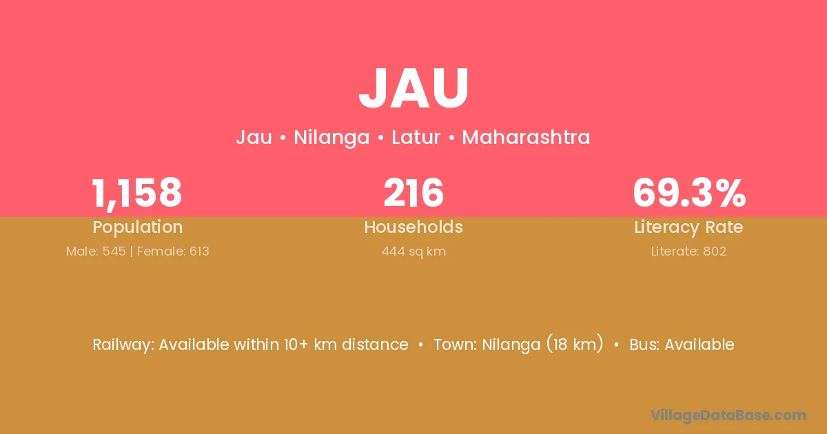 Nilanga (18 km) is the nearest town to Jau village for major economic activities and is located approximately 18 km away.