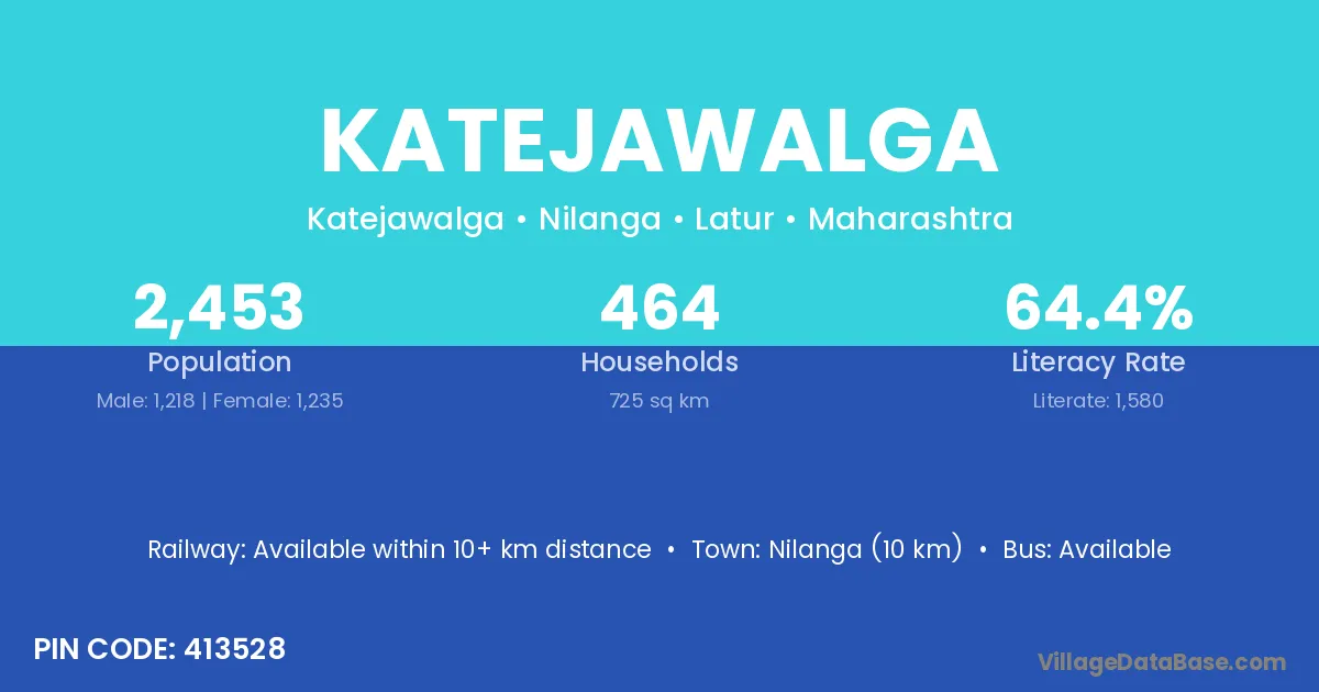 Nilanga (10 km) is the nearest town to Katejawalga village for major economic activities and is located approximately 10 km away.