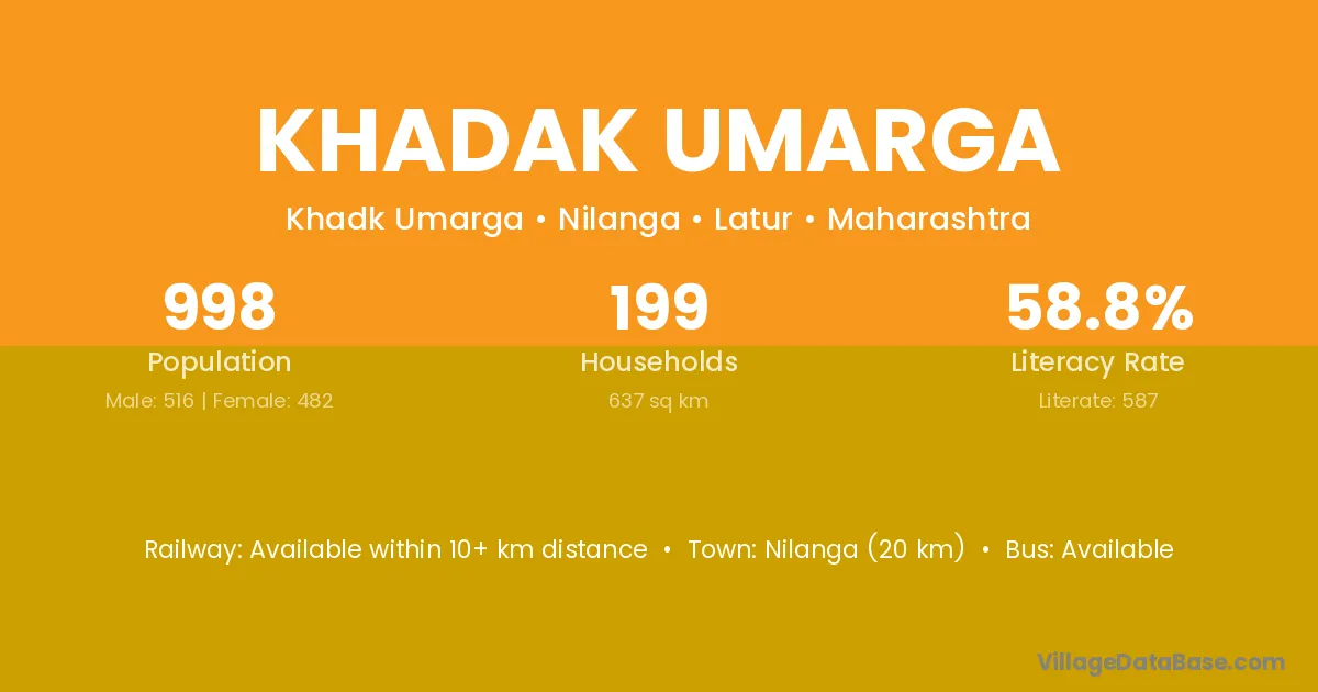 Nilanga (20 km) is the nearest town to Khadak Umarga village for major economic activities and is located approximately 20 km away.