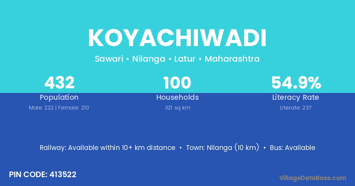 Koyachiwadi village has a total population of 432 people, of which 222 are males and 210 are females.