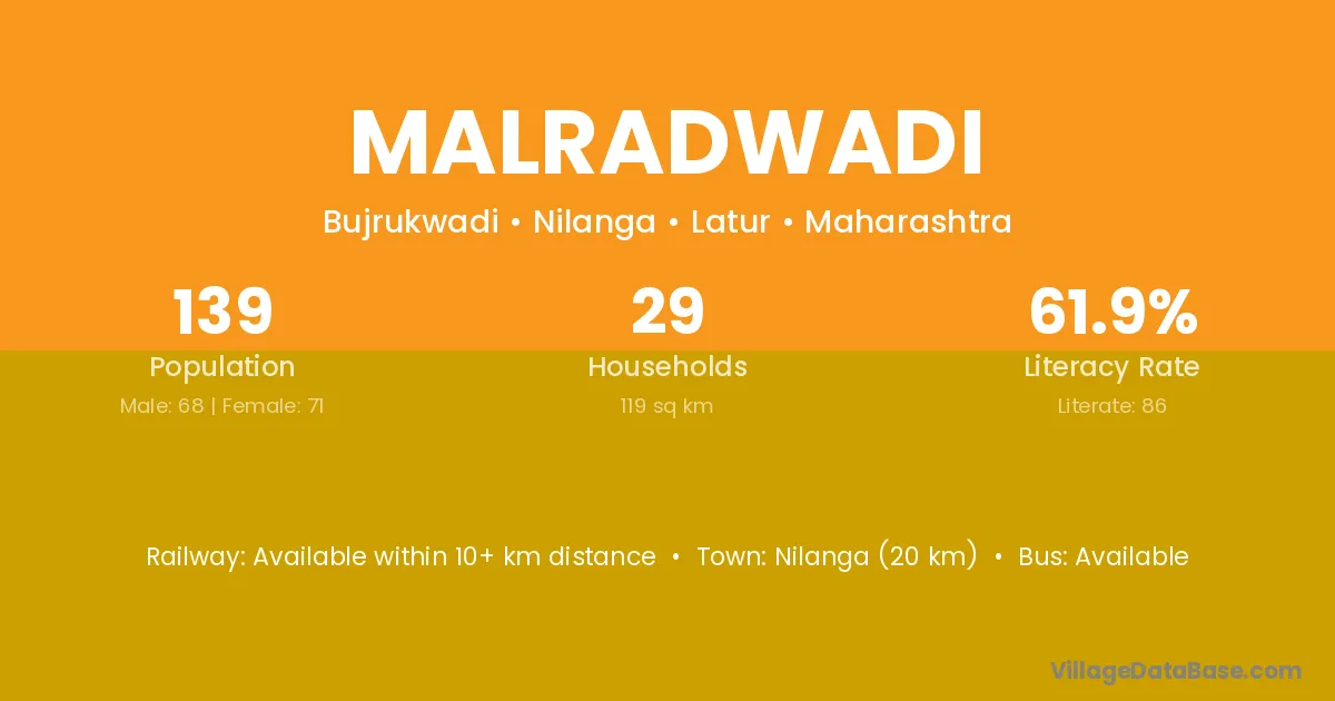 Malradwadi village has a total population of 139 people, of which 68 are males and 71 are females.