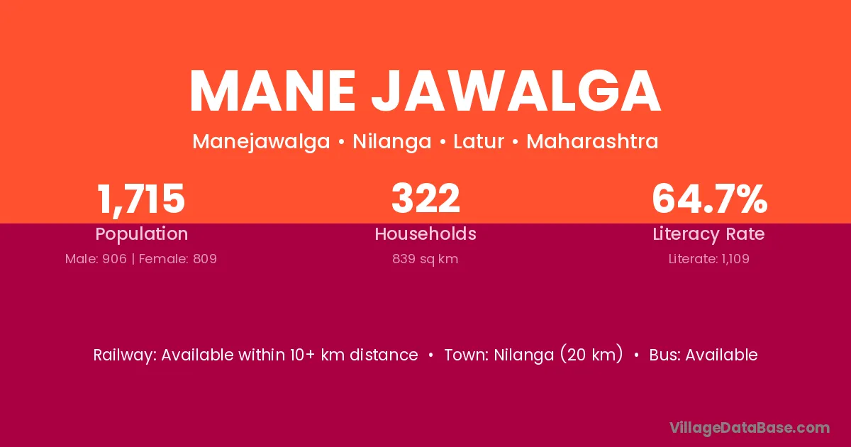Nilanga (20 km) is the nearest town to Mane Jawalga village for major economic activities and is located approximately 20 km away.
